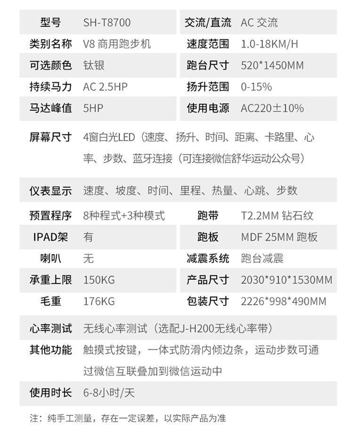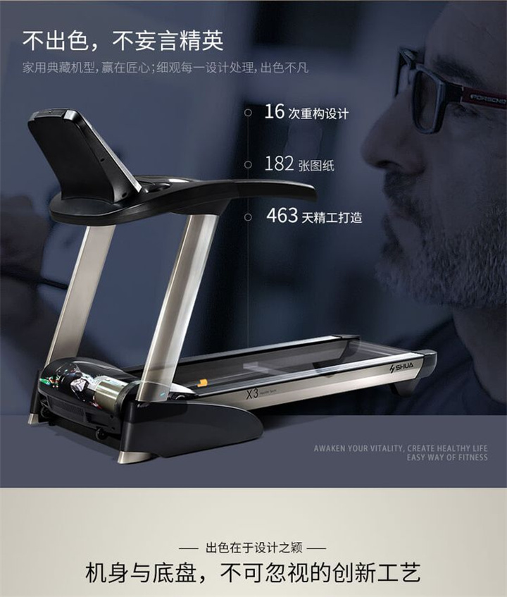 智能商用跑步機SH-T8919T-Y50(V1+)采用T2.2mm黑鉆紋(可選配:T2.4免維護跑帶)的跑帶,選用手握心率測試 自帶心率帶及增加心率控速(HRC)程序模塊測量心跳等數(shù)據(jù),跑步寬度達580mm,可承受180kg的使用者使用。