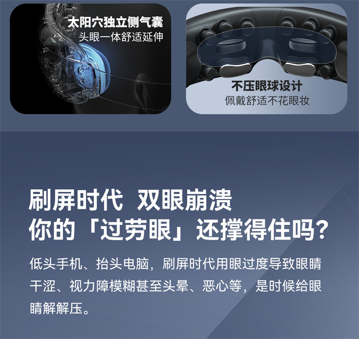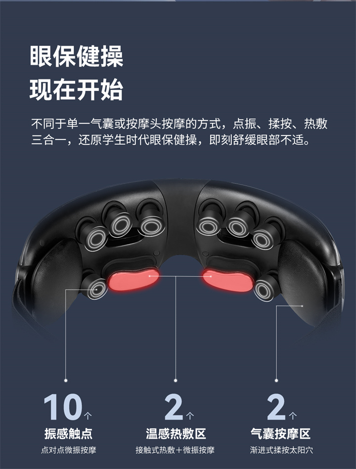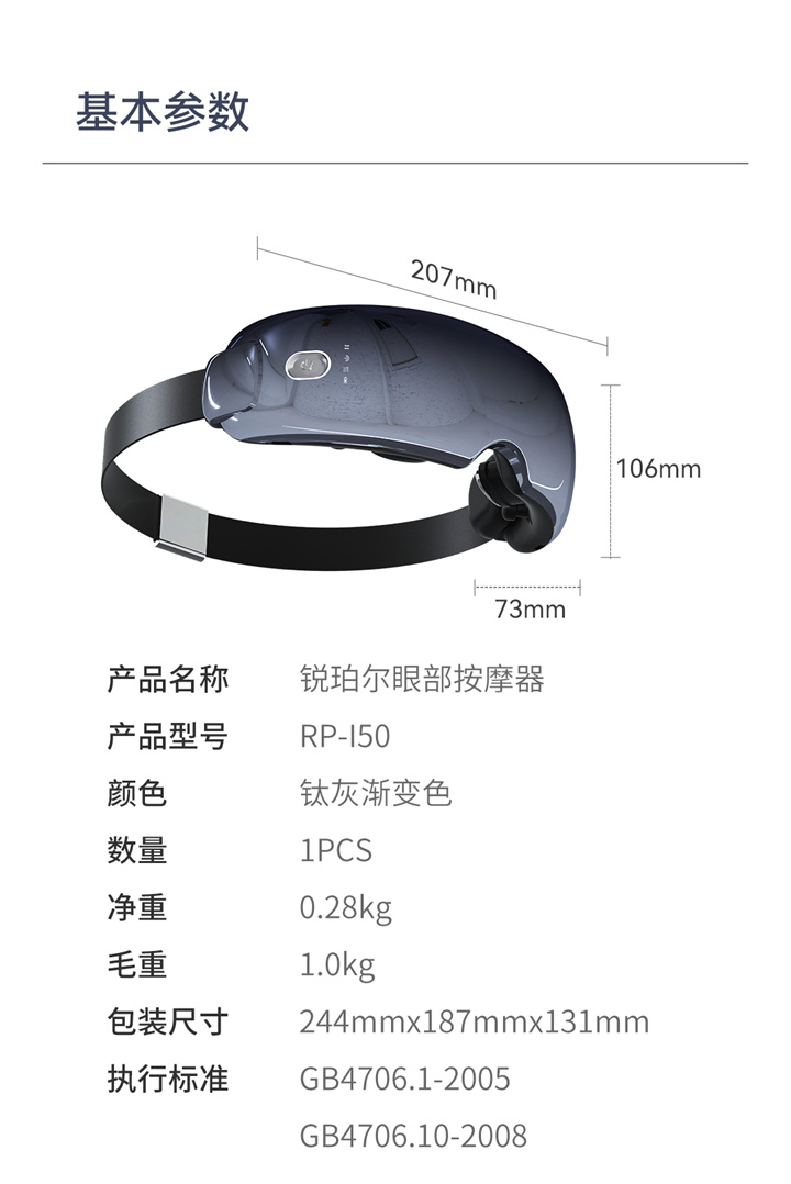 銳珀?duì)?/a>眼部按摩器RP-I50,根據(jù)國(guó)人眼型設(shè)計(jì),機(jī)身弧度更貼合眼眶,貼心預(yù)留立體凹槽,保護(hù)眼球,按摩后視力不模糊,自帶應(yīng)急可視窗,可舒緩全黑密閉焦慮感;內(nèi)置大自然的場(chǎng)景音效,讓眼睛和心靈雙重放松,還有藍(lán)牙連接,可以隨心聽歌、聽書等,更多神奇功能,等待您親自試戴發(fā)現(xiàn)……