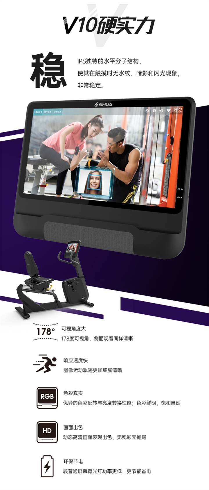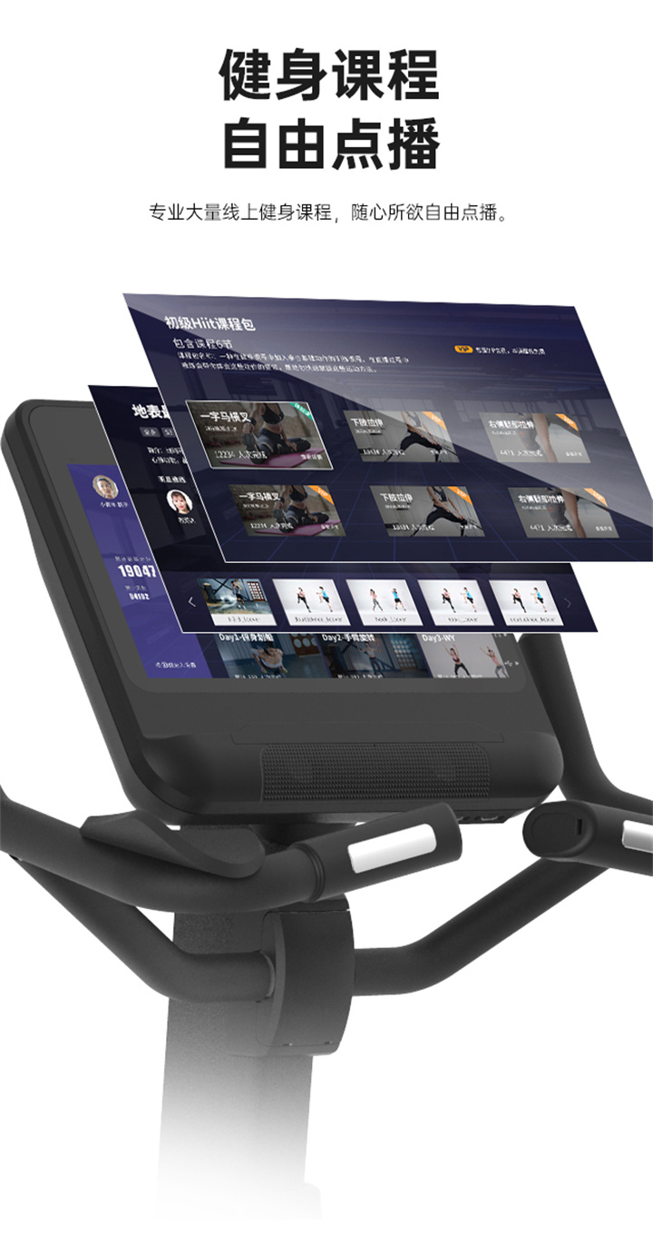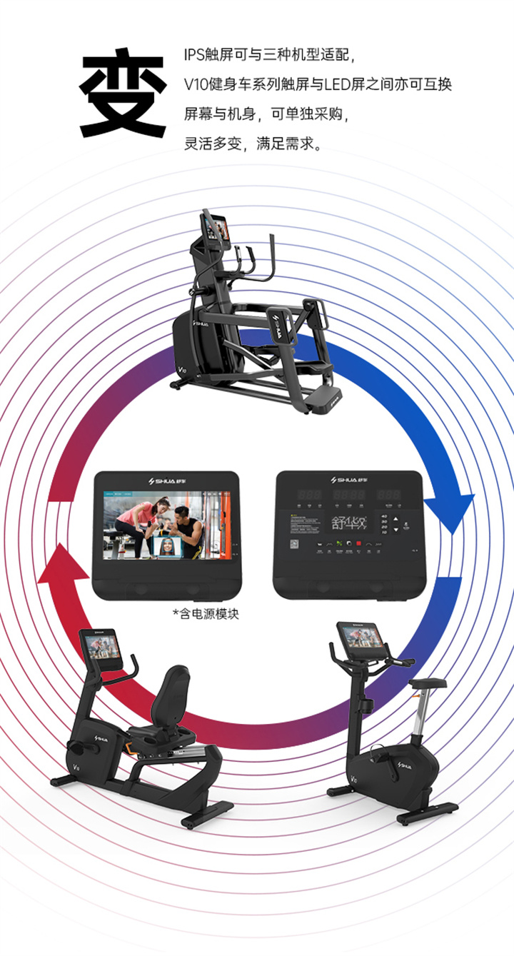 舒華立式商用健身車SH-B9100U(V10)觸屏版擁有超大顯示和操作屏幕, 可以任意設(shè)置阻力、時間和距離等參數(shù),還可以即時顯示心跳和轉(zhuǎn)速等數(shù)據(jù),同時,SH-B9100U提供多項科學(xué)運動處方,更輕松掌握運動節(jié)奏。