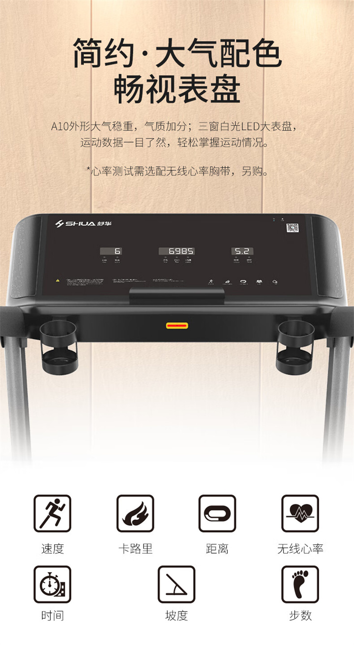 舒華跑步機(jī)SH-T5500采用T18mm的跑板,T1.6 鉆石紋的跑帶,運(yùn)用6位硅膠減震,對您跑步中的膝蓋進(jìn)行全方位的呵護(hù),選用手握心率測試,跑步面積達(dá)480×1350mm,可承受126kg的使用者使用。
