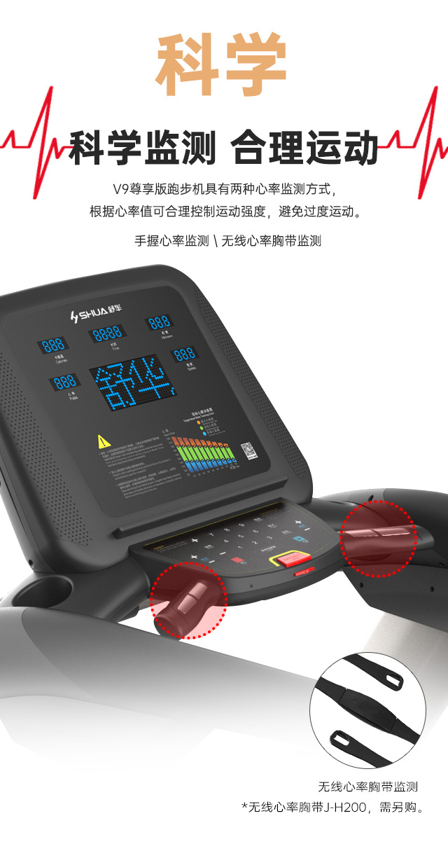 舒華V9尊享版跑步機(jī)SH-T899設(shè)有輔助上下機(jī)踏板的驅(qū)動(dòng)踏板,控制速度在-5至10km/h內(nèi)可調(diào),坡度也可在-3至15%內(nèi)可調(diào),跑臺(tái)尺寸是580×1570mm,持續(xù)馬力是AC 3.0HP。